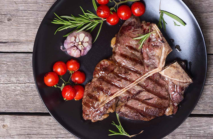 Consisting of two tender steaks (the strip and filet) connected by a T-shaped bone. Larger cuts may be perfect to share as a meal for two!